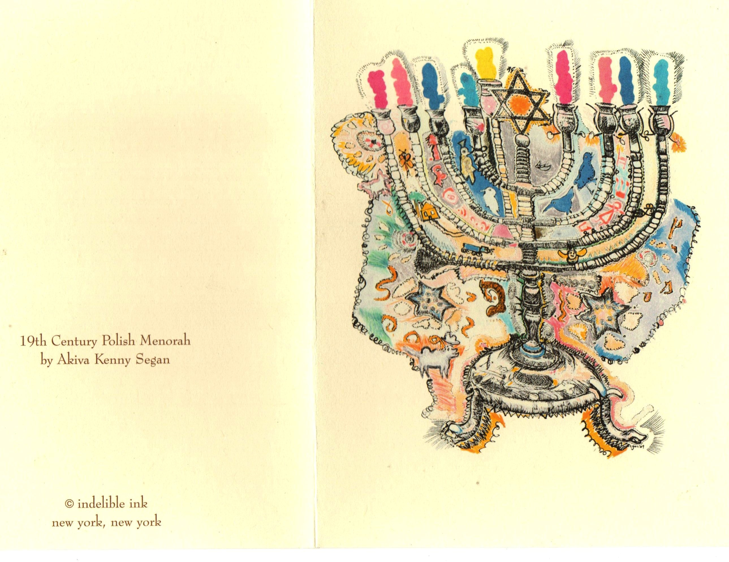 Media: Ink, colored pencil, gouache, melted Chanukah candle wax on pale blue etching paper