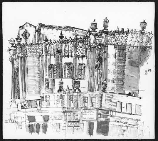 The Music Hall drawings and a linocut were each drawn on site, 1991. The Music Hall (also known as the Emerald Palace Theater, in Seattle), was a beautiful theater building; it opened to the public on April 19, 1929. It was torn down on orders of the family which owned it to make way for a businessman's hotel on the site.