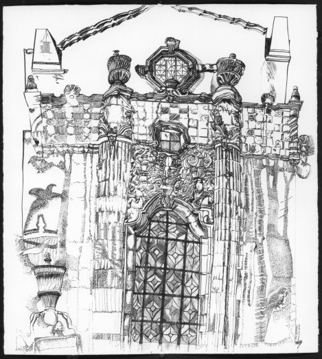 Drawn on 7th Avenue opposite the west side of the theater; the stained glass window furthest north, west side of the building, July 1991.
