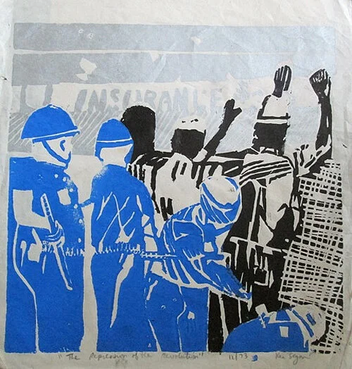 A linocut print I made in 1973 when I was a freshman college student, majoring in art, Parkland College, Champaign, Il. (Parkland was Parkland Junior College when I started, later Parkland Community College).