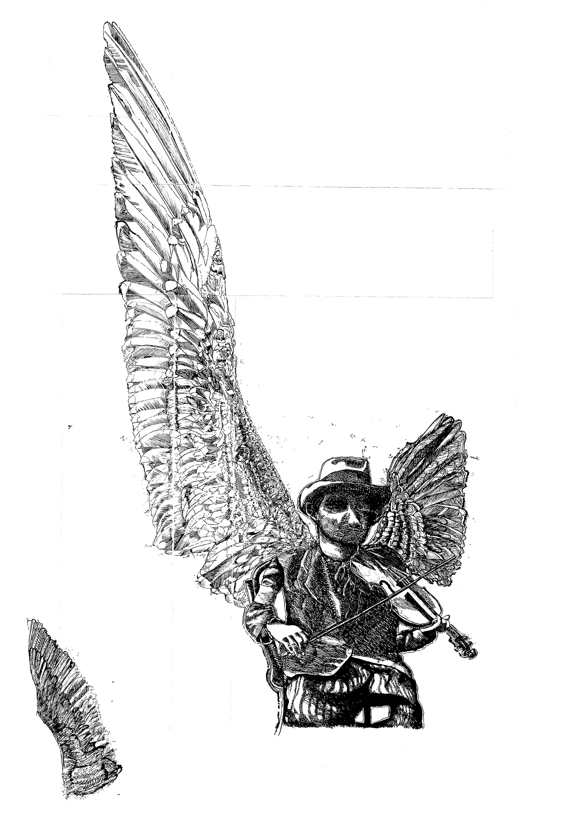 Drawn from a Warsaw Ghetto photo taken by Nazi soldier Heinz Jost, who went into the ghetto "illegally," but with his Nazi soldier's uniform, he wasn't stopped. Jost's notes stated: "This man was playing the same notes on his violin over and over again. His eyes followed me; I'm not sure if it was out of fear or because he was hoping for a coin. I believe this was also in Nowolipki Street."